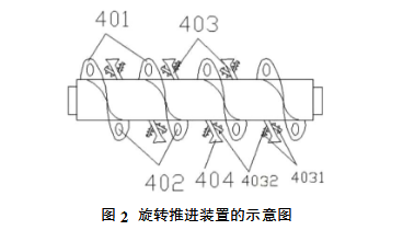 如圖1所示,本脈沖布袋除塵器用的二次除塵裝置,包括設(shè)置在脈沖布袋除塵器下箱體底部的導(dǎo)管2,還設(shè)有噴淋裝置3、旋轉(zhuǎn)推進(jìn)裝置4和出漿管5,導(dǎo)管的出口端與旋轉(zhuǎn)推進(jìn)裝置進(jìn)料端連接,在導(dǎo)管與旋轉(zhuǎn)推進(jìn)裝置的連接處還設(shè)置有噴淋裝置,噴淋裝置的噴水口穿過導(dǎo)管內(nèi)壁并朝向旋轉(zhuǎn)推進(jìn)裝置的輸送料腔內(nèi),在旋轉(zhuǎn)推進(jìn)裝置出料端連接出漿管;如圖2所示的旋轉(zhuǎn)推進(jìn)裝置4包括輸送料筒、設(shè)置在輸送料筒內(nèi)的傳動(dòng)軸以及帶動(dòng)傳動(dòng)軸旋轉(zhuǎn)的電機(jī),在傳動(dòng)軸上設(shè)有帶漏料孔402的螺旋葉片401,螺旋葉片之間還設(shè)置有攪拌棒403,攪拌棒403一端與傳動(dòng)軸固定連接,另一端設(shè)置清除輸送料筒內(nèi)壁灰塵的刮刀404;所述的噴淋裝置上還設(shè)有進(jìn)水開關(guān);所述的旋轉(zhuǎn)推進(jìn)裝置出料端設(shè)置有噴淋裝置;所述的傳動(dòng)軸兩側(cè)均設(shè)置攪拌棒403,且刮刀404與攪拌棒403之間的角度為75-135°。