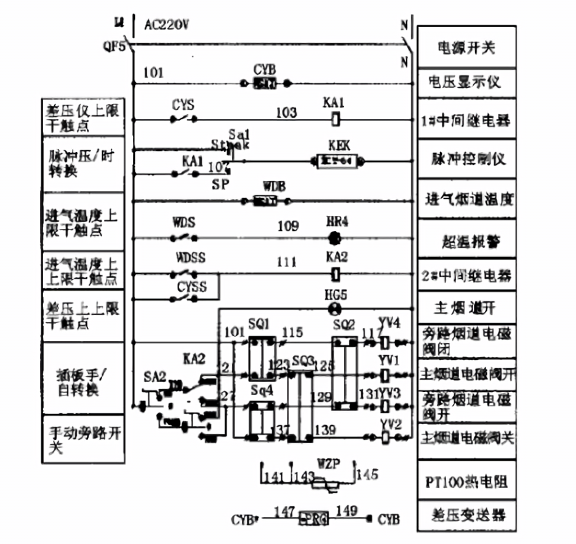 (2)插板閥設(shè)有自動/手動轉(zhuǎn)換開關(guān),打向自動檔時,受溫度表控制。當(dāng)煙溫升至160時報警。當(dāng)溫度180時,KA2工作旁路煙道閥門氣缸的電磁閥打開,當(dāng)旁路煙道完全打開時,氣缸停止運動,同時打開主煙道閥門氣缸的電磁閥氣缸進氣,當(dāng)閥門達到全關(guān)位置,電磁閥自動關(guān)閉,氣缸停止運動。當(dāng)煙氣溫度<140時,溫度變送器把檢測到的信號發(fā)出,系統(tǒng)先啟動主煙道閥門氣缸的電磁閥,使氣缸進氣,閥門達到全開位置,同時系統(tǒng)打開旁路煙道氣缸電磁閥氣缸進氣。當(dāng)氣缸將閥全關(guān)閉后氣缸停止運動,完成除塵器的離線與在線切換工作。